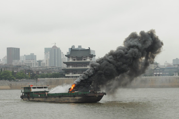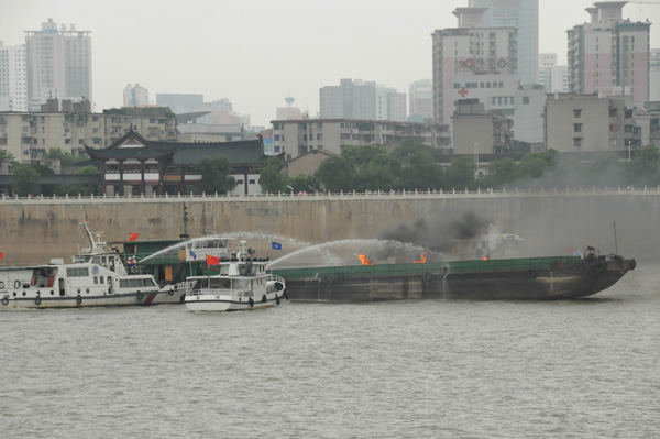 圖四 圖片說明 一、上午9時(shí),一艘300噸的普通貨船從長沙鑫宇公司碼頭出發(fā)下行航行至湘江杜甫江閣下游花炮平臺(tái)水域時(shí)候,與一搜客渡船發(fā)生碰撞,客渡船2名乘客受傷,10人落水,船體進(jìn)水失控,面臨沉沒危險(xiǎn)。 二、這搜普通貨船在避讓落水人員時(shí),又與經(jīng)過的另外一艘油船發(fā)生碰撞,致該船油艙破損,油船在自救過程中發(fā)生火災(zāi)、爆炸,并出現(xiàn)柴油泄漏。 三、湖南省水上搜救中心接到報(bào)警后,組織水上搜救隊(duì)緊急行動(dòng),各部門全力配合。落水乘客最先全部獲救,傷者也被送往醫(yī)院。之后遇險(xiǎn)船舶被拖往安全水域。 四、大約50分鐘后,油船大火被撲滅,溢油得到控制,油污被有效清除。 |