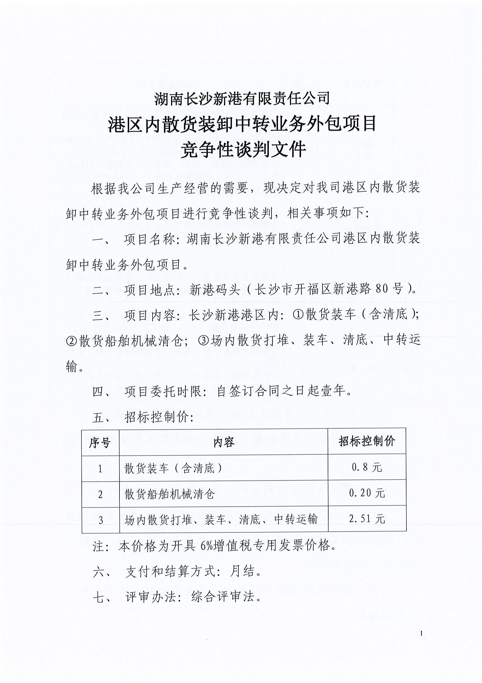 我公司決定對港區(qū)內(nèi)散貨裝卸中轉(zhuǎn)業(yè)務(wù)外包項(xiàng)目按照一般競爭性談判方式選擇外包單位,歡迎符合條件的單位參與項(xiàng)目的競爭談判。 一、 項(xiàng)目名稱:湖南長沙新港有限責(zé)任公司港區(qū)內(nèi)散貨裝卸中轉(zhuǎn)業(yè)務(wù)外包項(xiàng)目 二、 項(xiàng)目內(nèi)容: 長沙新港港區(qū)內(nèi):①散貨裝車(含清底);②散貨船舶機(jī)械清倉;③場內(nèi)散貨打堆、裝車、清底、中轉(zhuǎn)運(yùn)輸。 三、 項(xiàng)目委托期限:自簽訂合同之日起壹年。 四、 資格及資質(zhì)要求: (一)本項(xiàng)目不接受聯(lián)合體投標(biāo); (二)投標(biāo)人須自有大鏟車、小鏟車、轉(zhuǎn)運(yùn)自卸車輛,能保證我司兩條生產(chǎn)作業(yè)線同時(shí)作業(yè); (三)投標(biāo)人鏟車司機(jī)、車隊(duì)司機(jī)須持有相關(guān)職業(yè)資格證; (四)投標(biāo)人遞交響應(yīng)文件時(shí)須提交以下證明材料(復(fù)印件需加蓋公章): 1.企業(yè)法人營業(yè)執(zhí)照副本復(fù)印件; 2.法人資格證明書或具有單位公章及法定代表人簽章的授權(quán)委托書、法人身份證原件(或復(fù)印件); 3.投標(biāo)人自有車輛購置證明材料、司機(jī)職業(yè)資格證明材料復(fù)印件; 4.投標(biāo)人類似項(xiàng)目業(yè)績證明材料; 5.投標(biāo)人身份證原件及復(fù)印件。 五、招標(biāo)文件的獲取方式:招標(biāo)文件見本公告附件,投標(biāo)人在投標(biāo)截止時(shí)間前可自行下載或前往我司515室領(lǐng)取。 六、遞交響應(yīng)文件截止時(shí)間(及談判時(shí)間)和地點(diǎn): (一)遞交響應(yīng)文件的截止時(shí)間:2018年4月9日上午9:30。 (二)遞交文件及談判地點(diǎn):新港公司一樓北會議室。 (三)法人代表或授權(quán)人代表需準(zhǔn)時(shí)到會,出示身份證原件(授權(quán)人代表需出示授權(quán)委托書)并簽名以示出席,否則,其投標(biāo)文件將被拒收。 (四)逾期送達(dá)或者不按談判文件要求密封的響應(yīng)文件,將拒絕接收。 七、招 標(biāo) 方:湖南長沙新港有限責(zé)任公司 聯(lián) 系 人:周明德 聯(lián)系電話: 15874888034 2018年4月3日 附件: