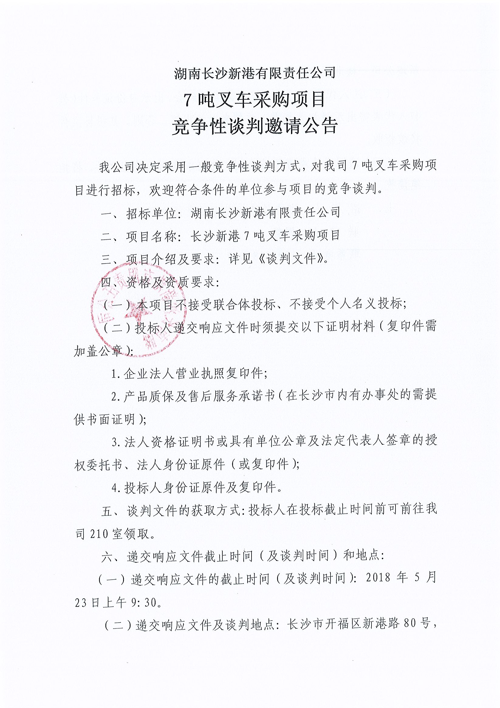 湖南長沙新港有限責(zé)任公司 7噸叉車采購項(xiàng)目競爭性談判邀請公告