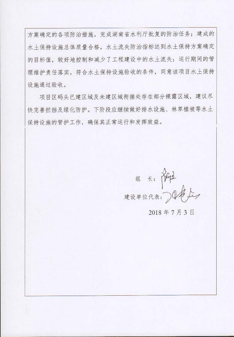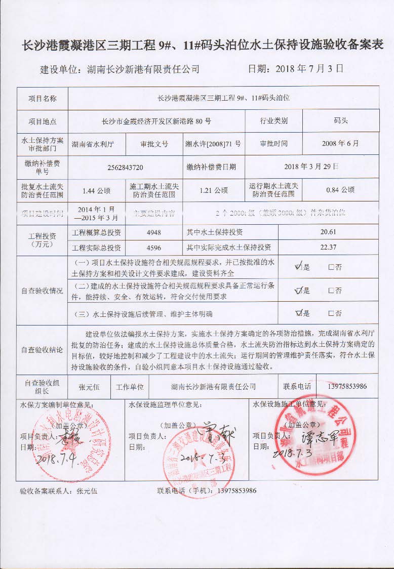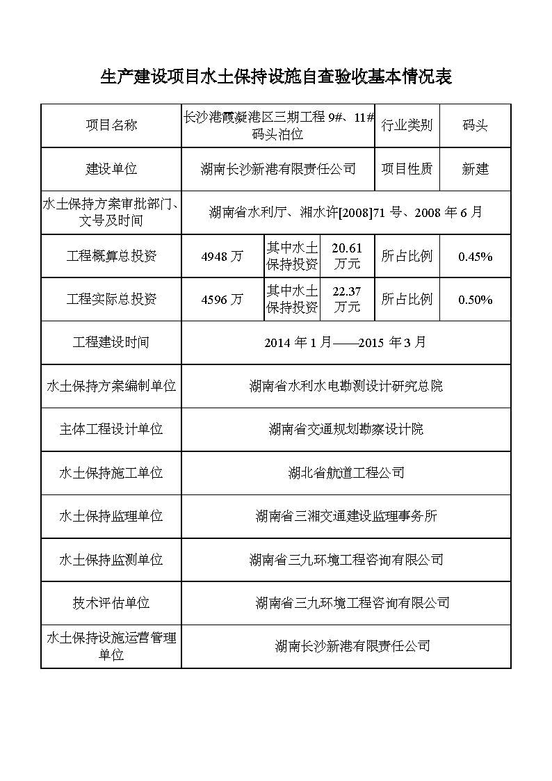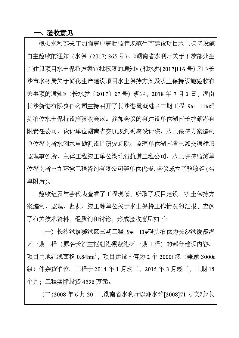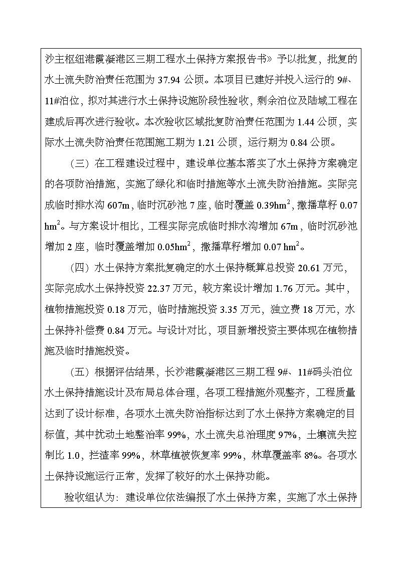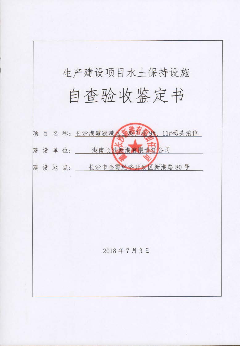 根據(jù)水利部關(guān)于加強(qiáng)事中事后監(jiān)管規(guī)范生產(chǎn)建設(shè)項(xiàng)目水土保持設(shè)施自主驗(yàn)收的通知(水保(2017) 365號(hào))、《湖南省水利廳關(guān)于下放部分生產(chǎn)建設(shè)項(xiàng)目水土保持方案審批權(quán)限的通知》(湘水辦[2017]116號(hào))和《長沙市水務(wù)局關(guān)于簡化生產(chǎn)建設(shè)項(xiàng)目水土保持方案及水土保持設(shè)施驗(yàn)收有關(guān)事項(xiàng)的通知》(長水發(fā)〔2017〕27號(hào))規(guī)定,2018年7月3日,湖南長沙新港有限責(zé)任公司主持召開了長沙港霞凝港區(qū)三期工程9#、11#碼頭泊位水土保持設(shè)施驗(yàn)收會(huì)議,會(huì)議成立了驗(yàn)收組。 通過深入工程現(xiàn)場(chǎng)核查,并查閱相關(guān)檔案資料,驗(yàn)收小組認(rèn)為本工程積極落實(shí)了各施工區(qū)域的水土流失防治工作,水土保持設(shè)施質(zhì)量總體合格,水土流失防治指標(biāo)達(dá)到了水土保持方案確定的目標(biāo)值,符合水土保持設(shè)施竣工驗(yàn)收的條件。驗(yàn)收組一致同意長沙港霞凝港區(qū)三期工程9#、11#碼頭泊位水土保持設(shè)施通過驗(yàn)收。經(jīng)驗(yàn)收組與會(huì)議審議,形成了《長沙港霞凝港區(qū)三期工程9#、11#碼頭泊位水土保持設(shè)施自查驗(yàn)收鑒定書》。