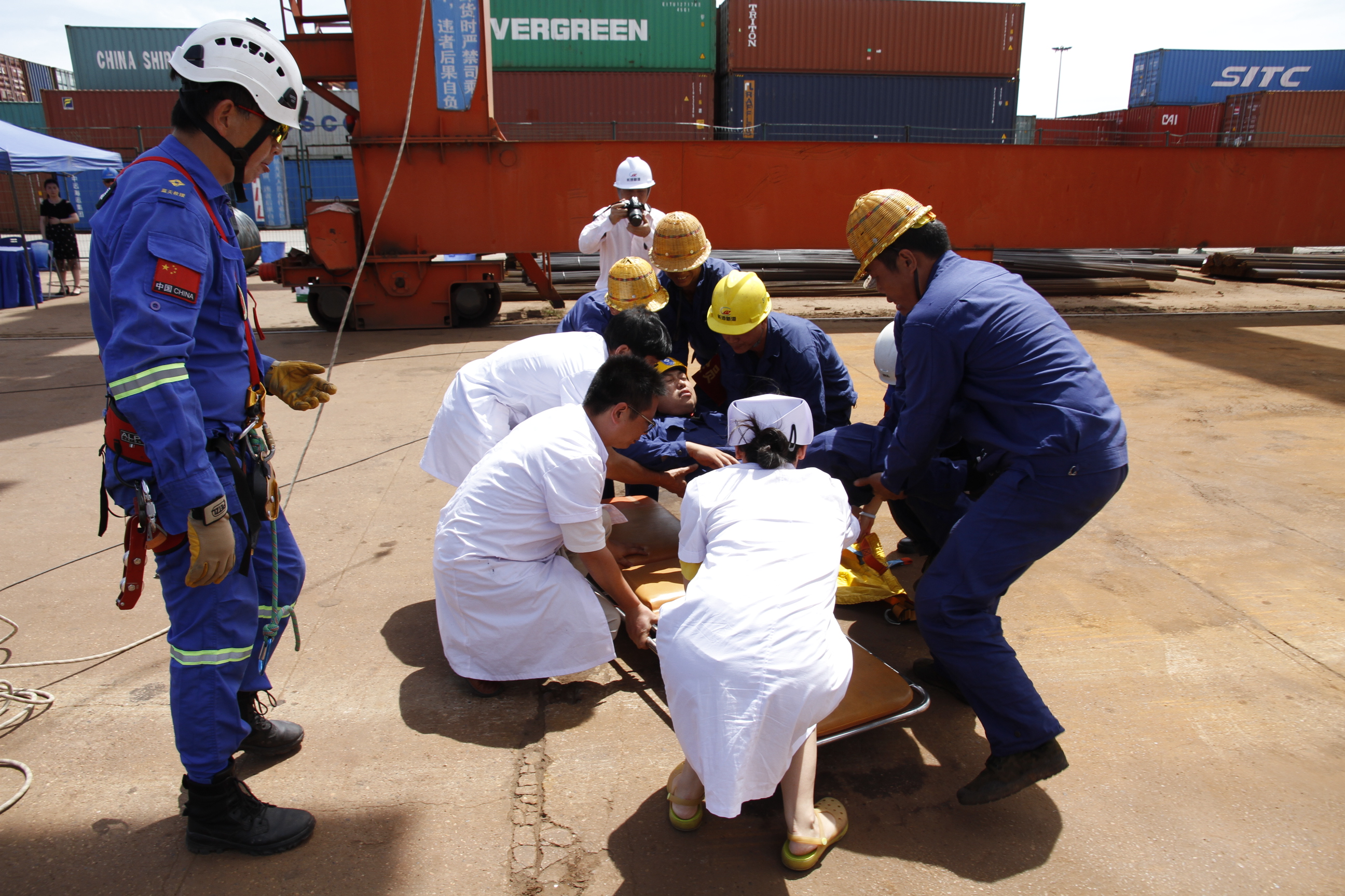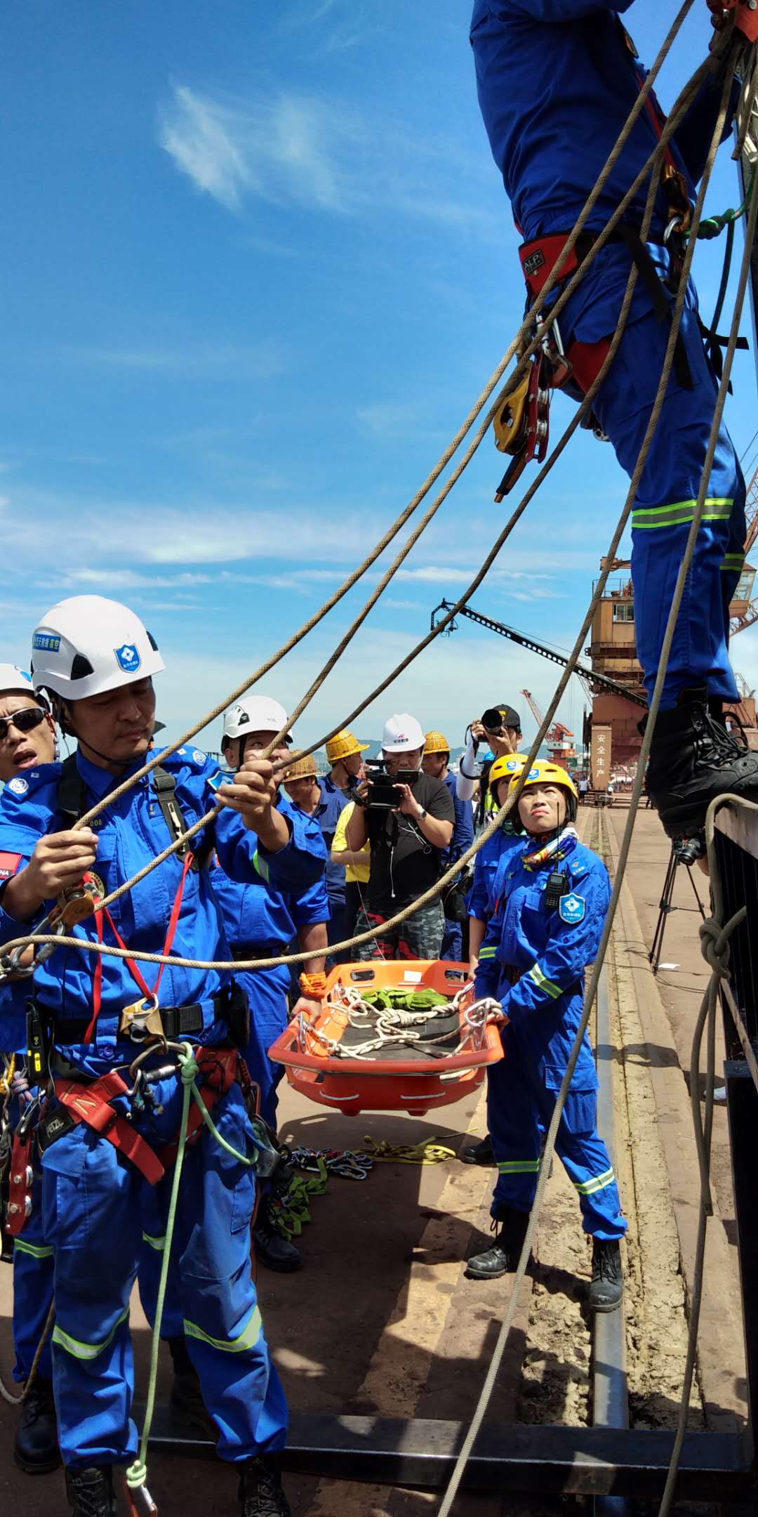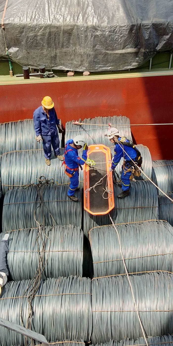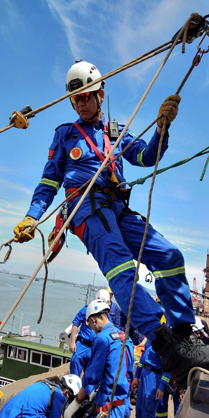 藍(lán)天救援隊員將受傷裝卸工固定在擔(dān)架上,準(zhǔn)備救援上岸。