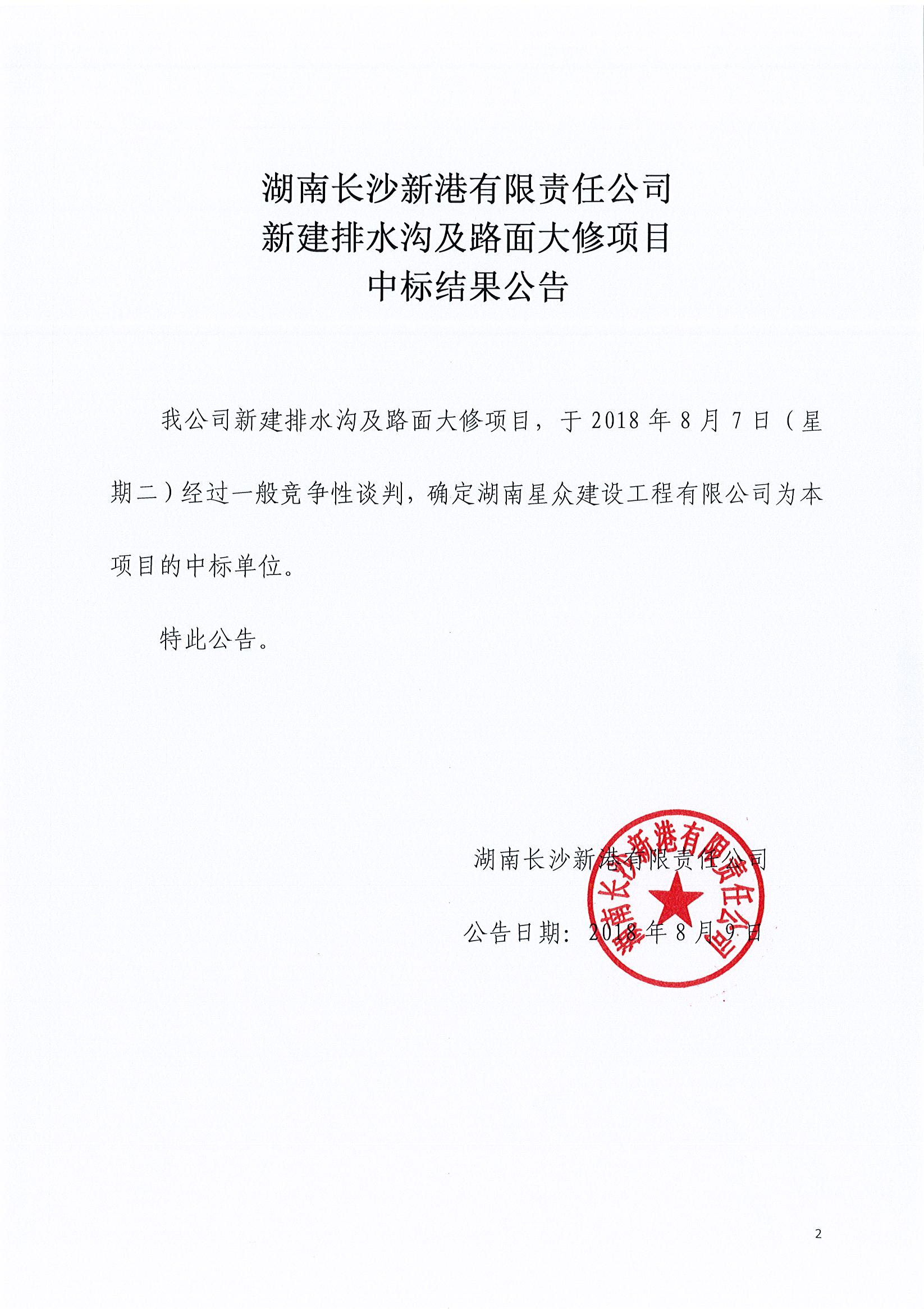 湖南長沙新港有限責(zé)任公司 新建排水溝及路面大修項目中標(biāo)結(jié)果公告
