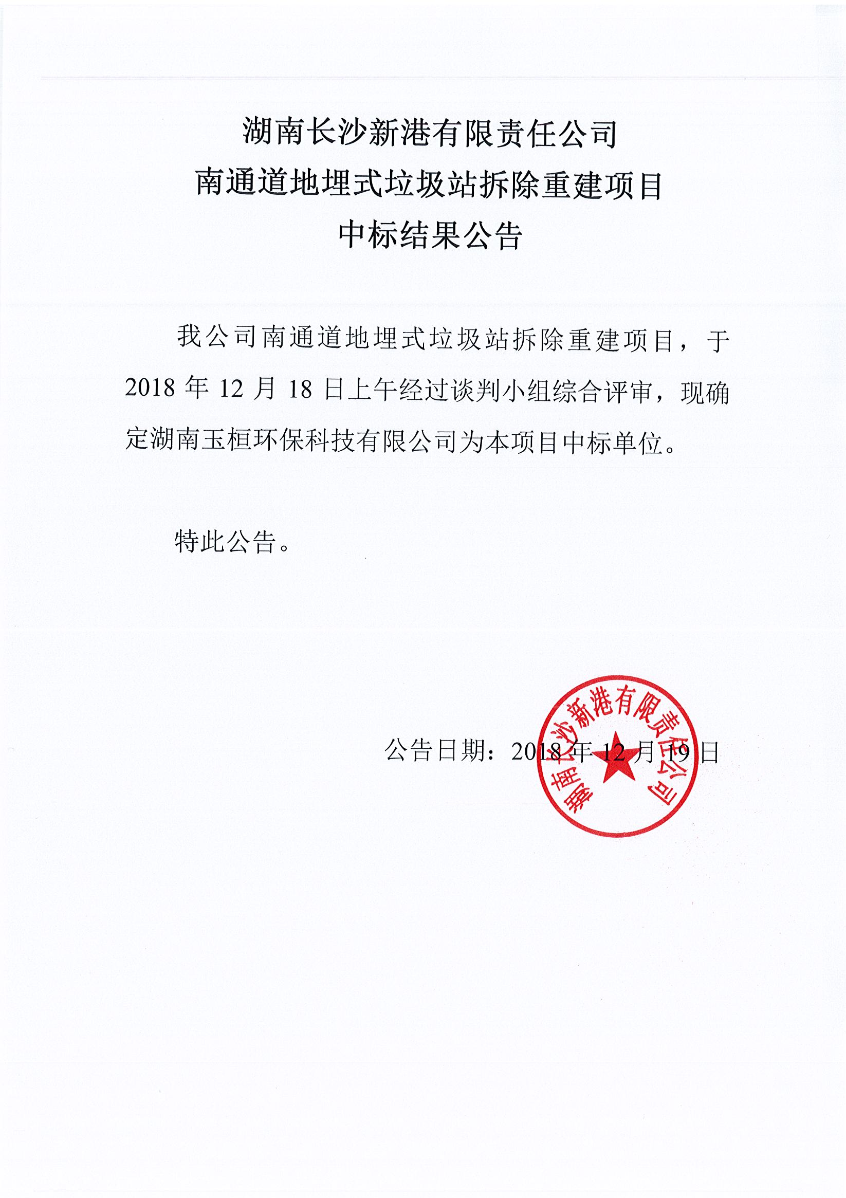 湖南長(zhǎng)沙新港有限責(zé)任公司 南通道地埋式垃圾站拆除重建項(xiàng)目中標(biāo)公告