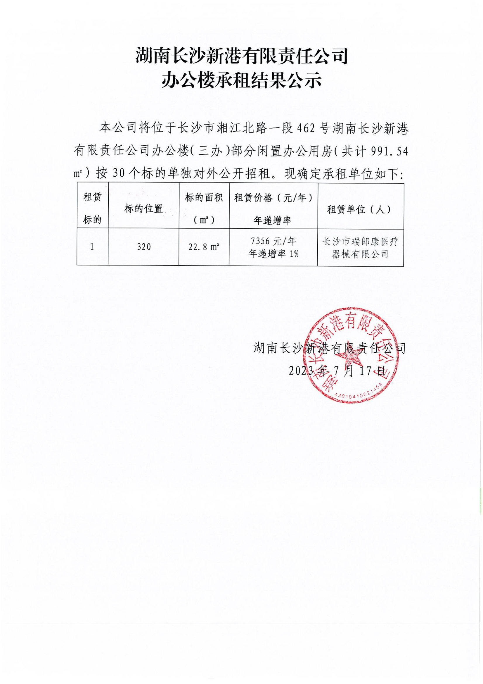 湖南長(zhǎng)沙新港有限責(zé)任公司辦公樓承租結(jié)果公示(320)