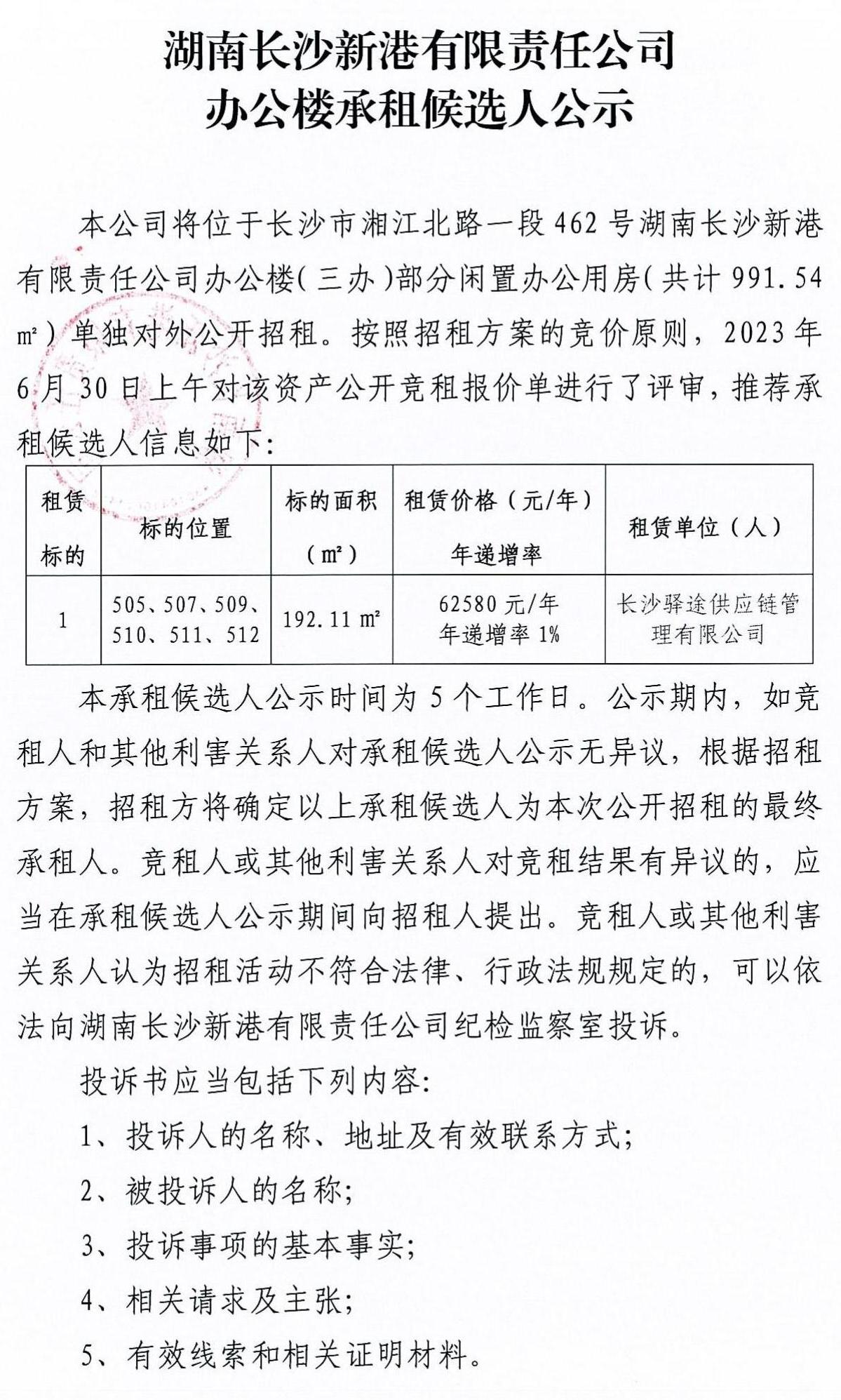 湖南長(zhǎng)沙新港有限責(zé)任公司辦公樓承租候選人公示