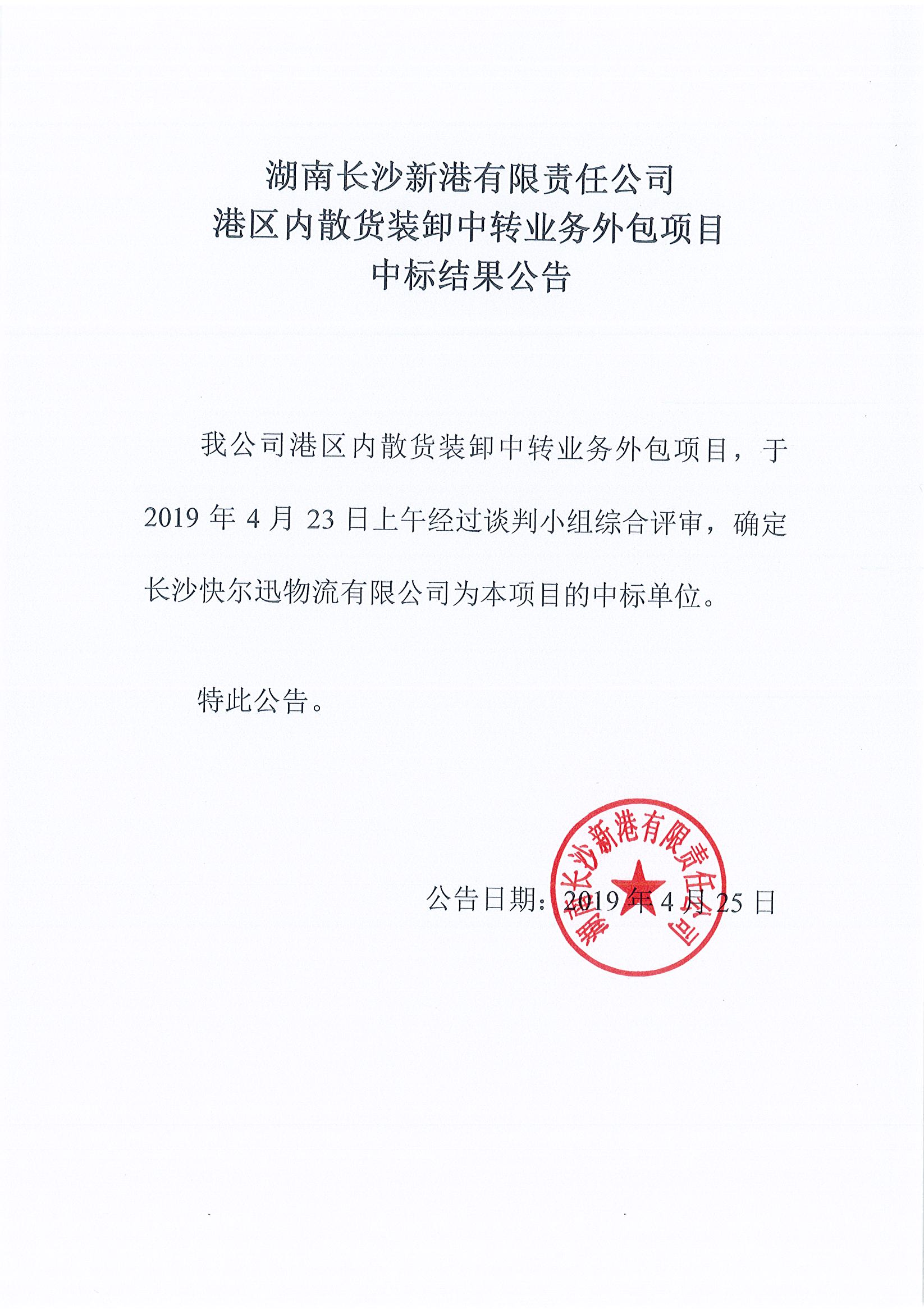 湖南長沙新港有限責任公司港區(qū)內(nèi)散貨裝卸中轉(zhuǎn)業(yè)務(wù)外包項目中標結(jié)果公告