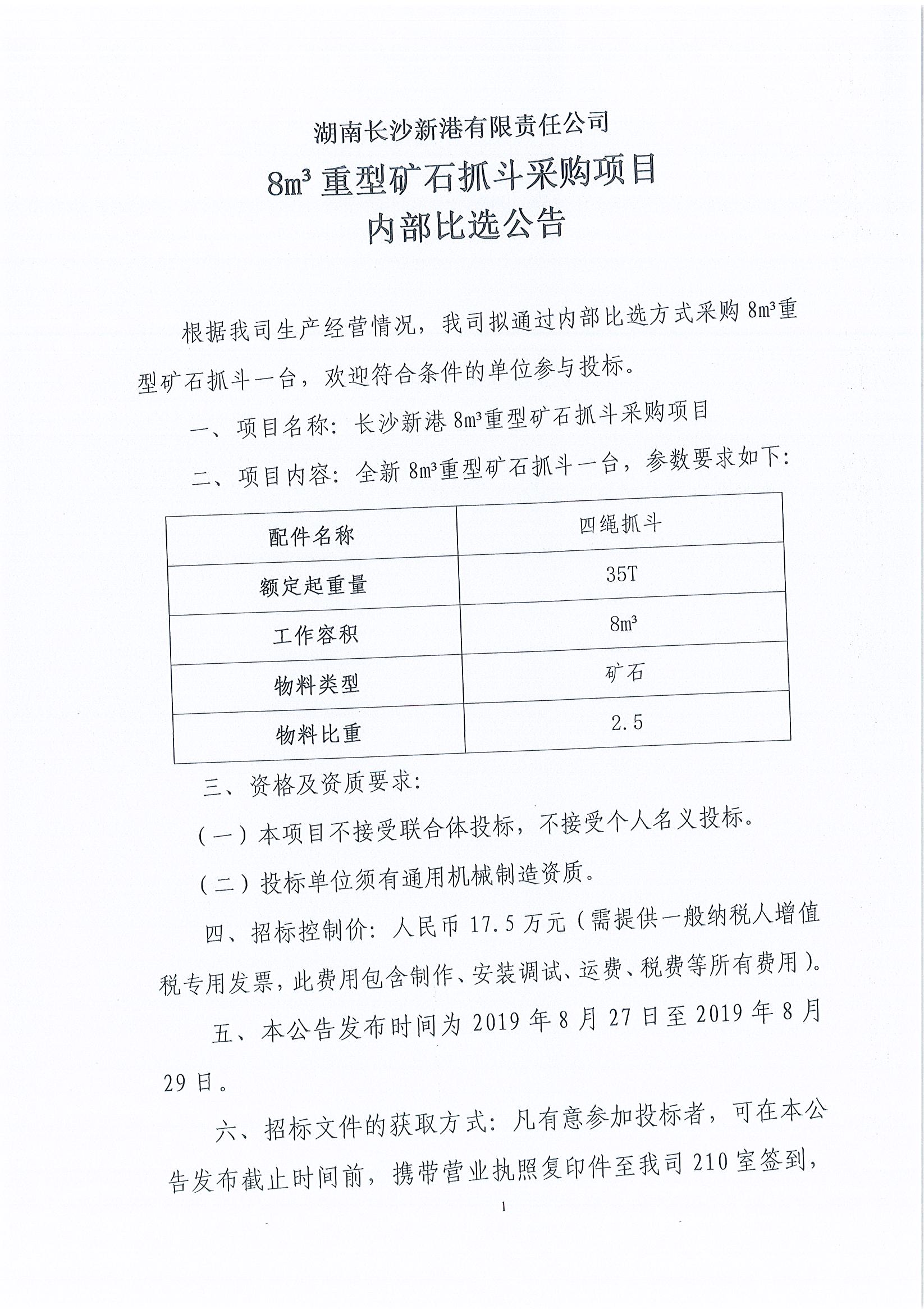 湖南長沙新港有限責(zé)任公司8m³重型礦石抓斗采購項(xiàng)目內(nèi)部比選公告