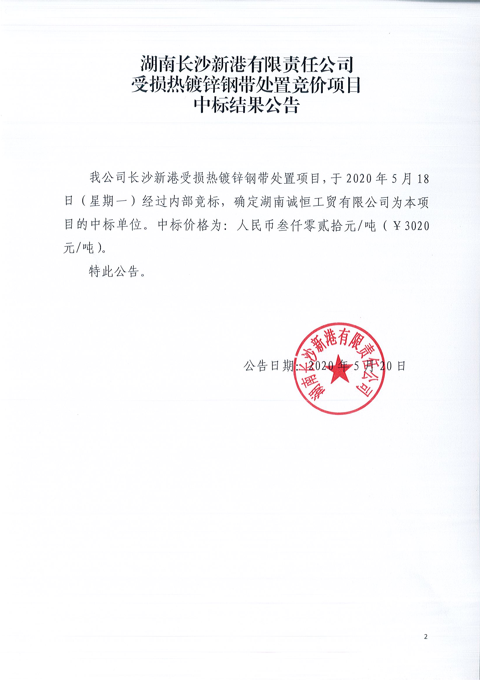 湖南長沙新港有限責(zé)任公司受損熱鍍鋅鋼帶處置競價(jià)項(xiàng)目中標(biāo)結(jié)果公告